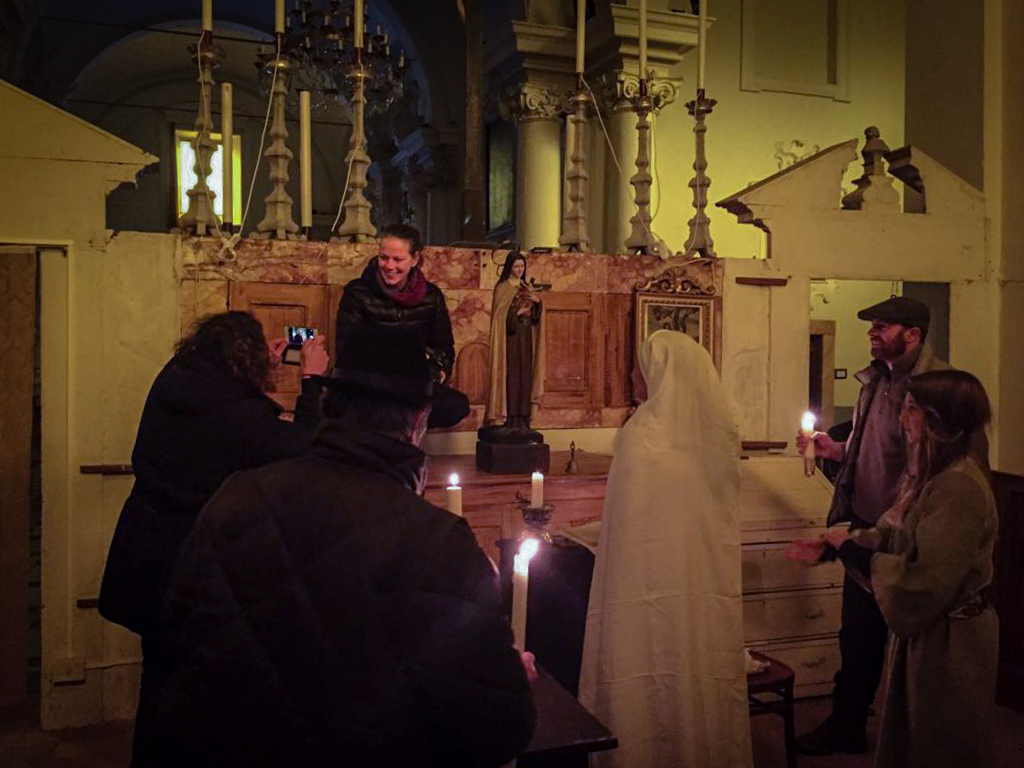 After such a wet day everyone was happy to let the director's wife Marzia blaze a warm hairdryer at our soaked heads. With warm tea, a wood fire and some food we all came back to our senses, tired but satisfied. No time to linger much, as day two was waiting for us........shooting in the church of the centuries old Monastery that was once the first settlement in the valley of Marradi and San Benedetto (where we live). Ice cold, no light to be considered, no heating......eskimo day again!!! And monkey bar acrobatics for me ;-)